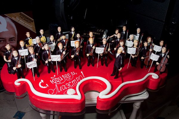 Кульминационным моментом вечера стало торжественное появление уникального торта, подаренного Владимиру Спивакову Кондитерским Домом «AZALE». На этом шедевре кулинарного искусства именинник и его восхищенные гости увидели миниатюрные шоколадные копии всех музыкантов оркестра во главе самим маэстро. Честь первыми отведать удивительный торт выпала экс-первым леди Франции и России — Бернадетт Ширак и Наине Ельциной.