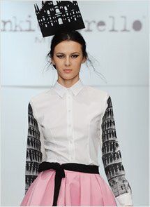 Так, мех, мелированный в яркие тона — зеленый, красный — в контексте нынешнего экономического кризиса Европы, где Италия на почетном четвертом месте в расстрельном списке после Греции, Ирландии и Испании, не мех, а лишь символ меха. Затем, все знают, что в Италию едут, с одной стороны, за сувенирами, с другой — за одеждой. Модика и Джильотти, с присущей народам Лация самоиронией, взяли и соединили два этих элемента в один, при помощи платьев с принтами, изображающими Коллизей, Пизанскую башню и статуи Давида Микеланджело.