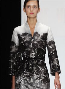 Ссылаясь на эпоху самого расцвета научно-технической революции XX века, коллекция, с одной стороны, использовала целую россыпь различных тканевых фактур — твид, кожа, овчина, кружево, шелк, шерстяное джерси — а с другой, все еще находилась в плену декоративных стандартов эпохи Возрождения, с ее фактурными пряжками и выходящими на первый план поясами.