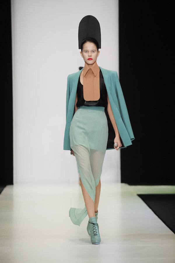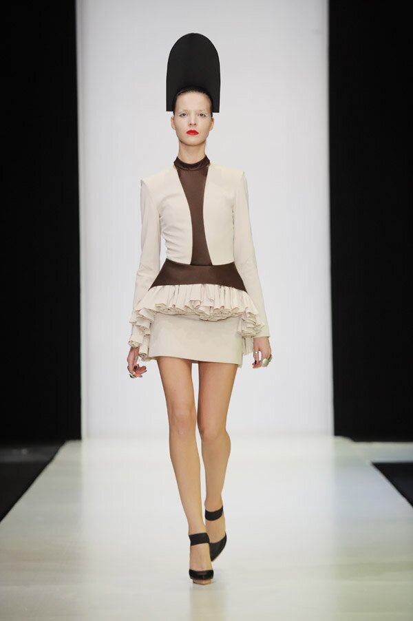 Безупречно орудующий в контексте времени, Бессарион обратился к теме балета, показав, как обычно, концептуалистическую коллекцию буквально за несколько дней до открытия обновленной главной сцены Большого театра. Намеренно оставаясь верным жестким линиям кроя, присутствовавшим в его работах последние два сезона, Бессарион также сохранил стремление к трехмерности, страсть к мелькающим то тут, то там оборкам, сливочному белому цвету, а также свои фирменные удлиненные пиджаки.