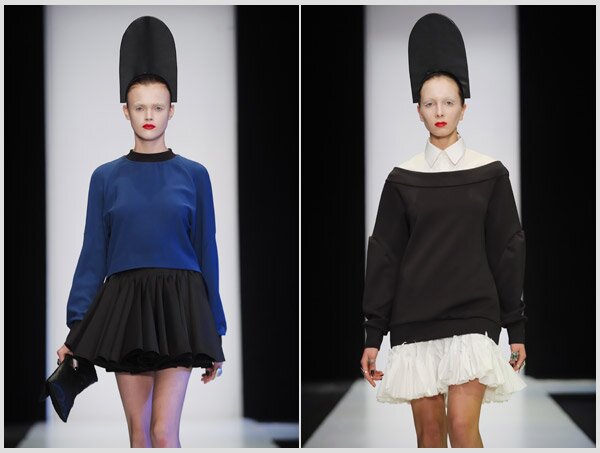 Поскольку все жемчужины русского балета зиждутся на русском народном фольклоре, его тема была воплощена в оформлении показа через массивные черные кокошники. Последние смотрелись удивительно современно в сочетании с классическими лодочками на высоком каблуке.