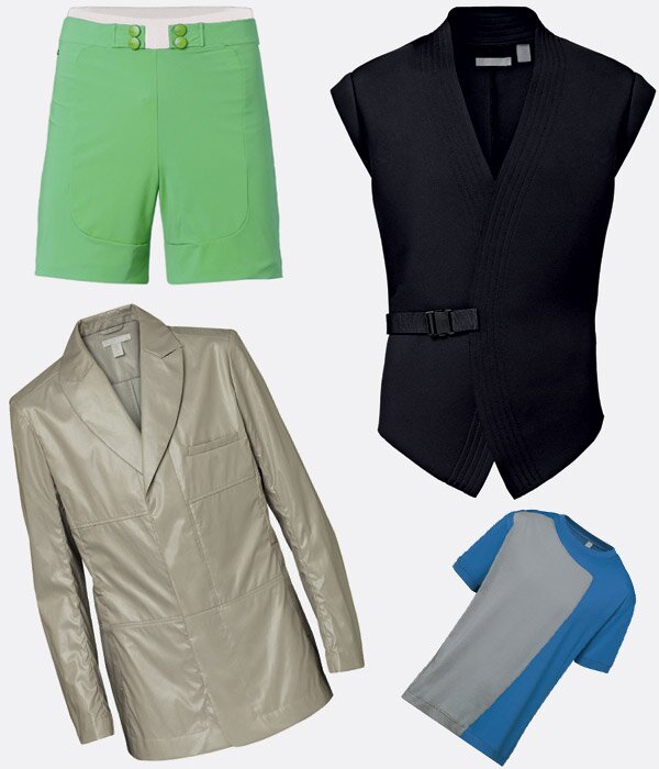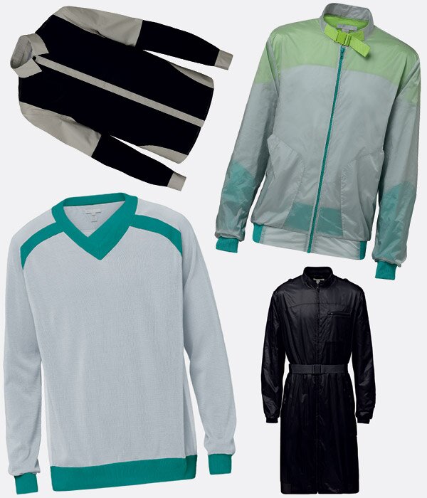 Несмотря на преобладание классических моделей, в коллекции также встречаются и ассиметричные рубашки-поло, и кожаные куртки, а также джинсовые модели классического кроя или с вшитыми, как в спортивной форме для фехтования, наколенниками. Пряжка – это наиболее часто встречающийся дизайнерский элемент в одежде и обуви, который призван подчеркнуть спортивный дух всей коллекции.