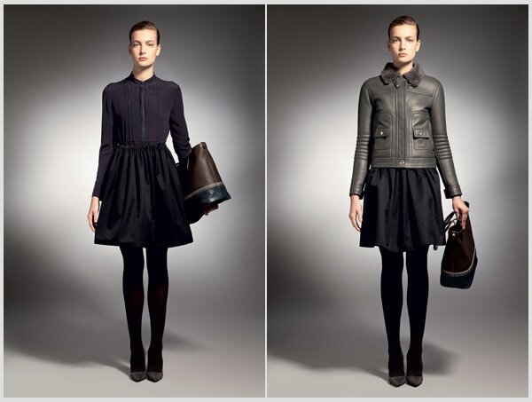 В поисках новых объемов Bally решила поэкспериментировать с небольшим гофрированием линии талии своих юбок, которые прекрасно сочетаются с кофтами из кашемира и меха енота и блузами из шелка с кожанами элементами.