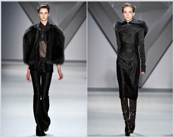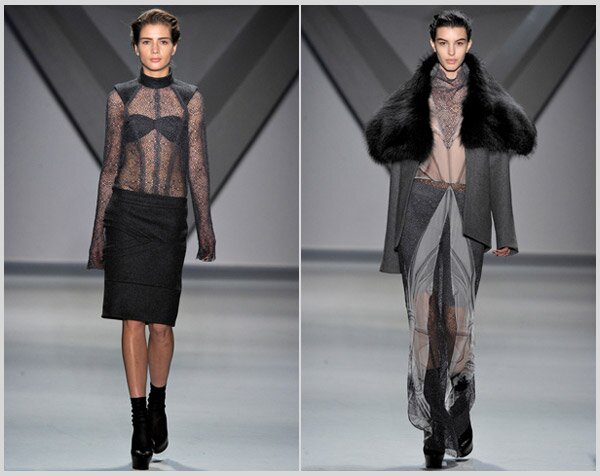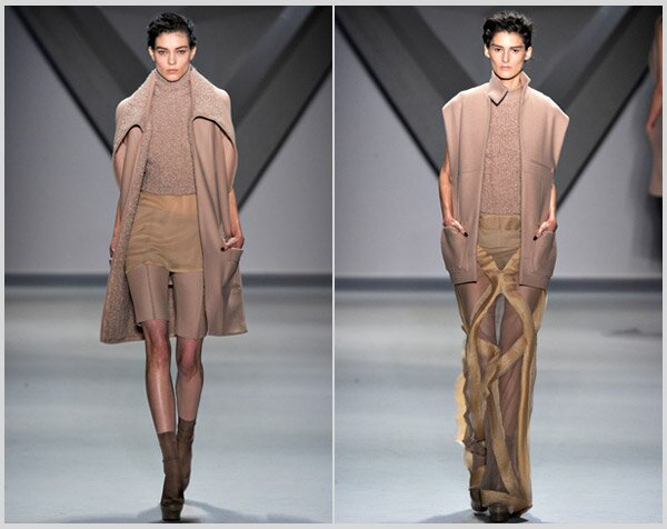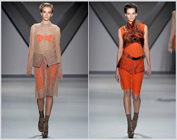 Удивляют и декоративные воротники из енота, которые предлагается носить с кашемировыми свитерами. Безусловно, такие комплекты подходят только для теплой осени. Модели из серого жаккарда станут, вероятно, наиболее востребованы в этой коллекции. Хотя летящие платья и полупрозрачные юбки мандаринового цвета также будут популярны вследствие того, что именно этот цвет признан трендом 2012 года.