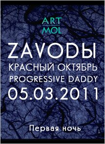 «ZAVODЫ» — это уже известный в сфере культуры и отдыха проект, представляющий из себя серию творческих мероприятий на площадках арт-заводов Москвы. В период февраль - июнь 2011 года, в рамках проекта свои работы представят, талантливые молодые люди в различных сферах искусства: фотография, дизайн, живопись, музыка... Проект «ZAVODЫ», как и все проекты объединения Артмол совмещает в себе познавательный и развлекательный аспект.